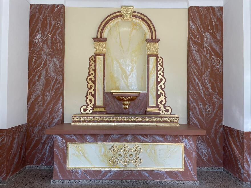 Todo el trabajo ha corrido a cargo del restaurador José Vicente Bonete, responsable de otras actuaciones en favor de elementos y edificios que forman parte del patrimonio histórico y artístico de Mutxamel, como la Mare de Déu de Loreto, la ermita de Montserrat o los altares de la Iglesia El Salvador. Su labor ha consistido en la eliminación de las capas de papeles que rodeaban el altar, con paredes que estaban muy dañadas, y la restauración de los zócalos de pintura que imitan al mármol, tal y como era la decoración que inicialmente tenía esta ermita. Además, se ha compuesto un altar acorde a estos zócalos originales, donde se ha marmolizado la madera, dotándola de un aspecto limpio y elegante.