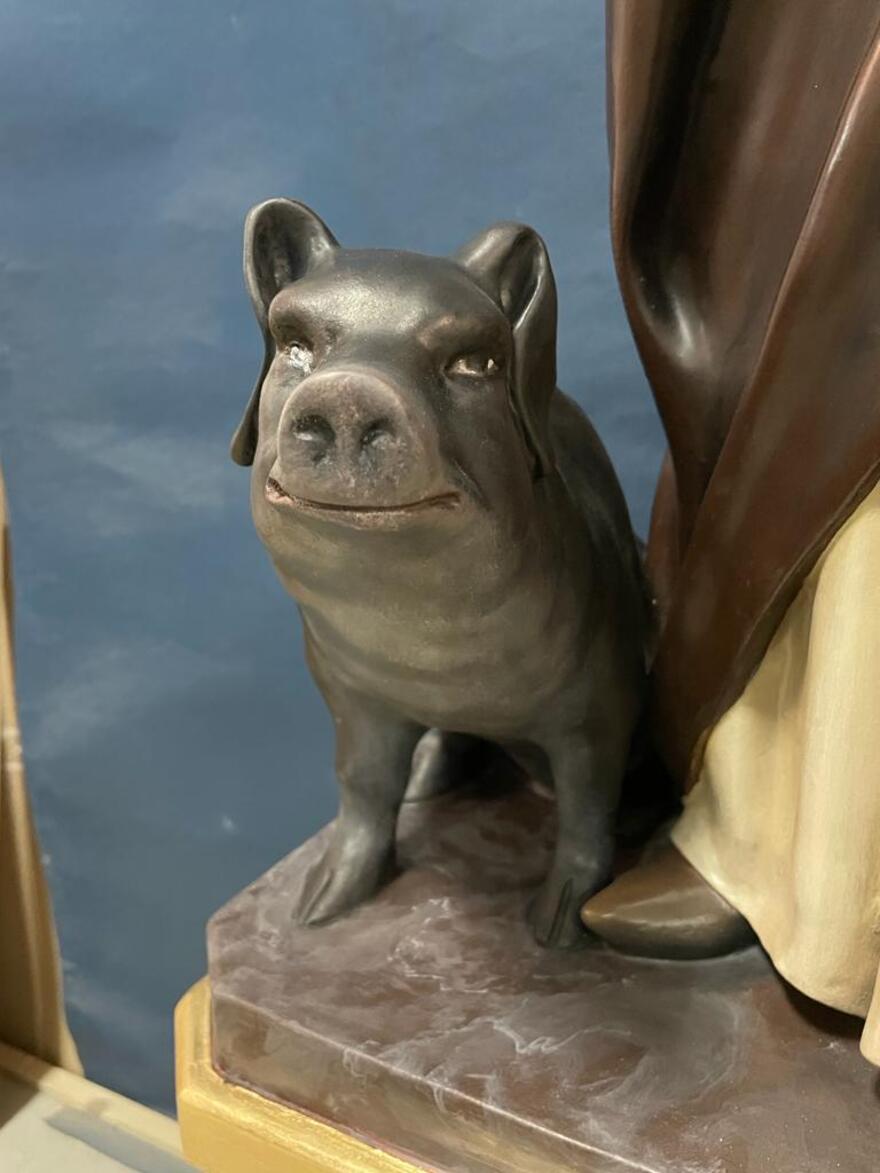 Como es requisito de estos trabajos, se han restaurado los colores originales de la imagen, que a sus pies está acompañada por un cerdo. Al comenzar la escultura del marranet, se ha descubierto que el animal tenía ojos bajo de las capas de pintura, aplicadas en la última restauración, allá por los años 80. El marranet de Sant Antoni sigue siendo negro, pero ahora tiene pupilas.