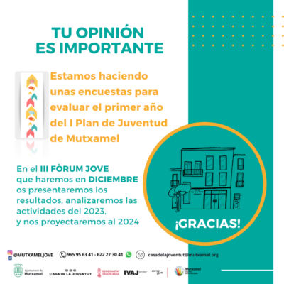 Otro año más, queremos contar con tu opinión para evaluar y seguir construyendo de manera participativa el I Plan de Juventud de Mutxamel.