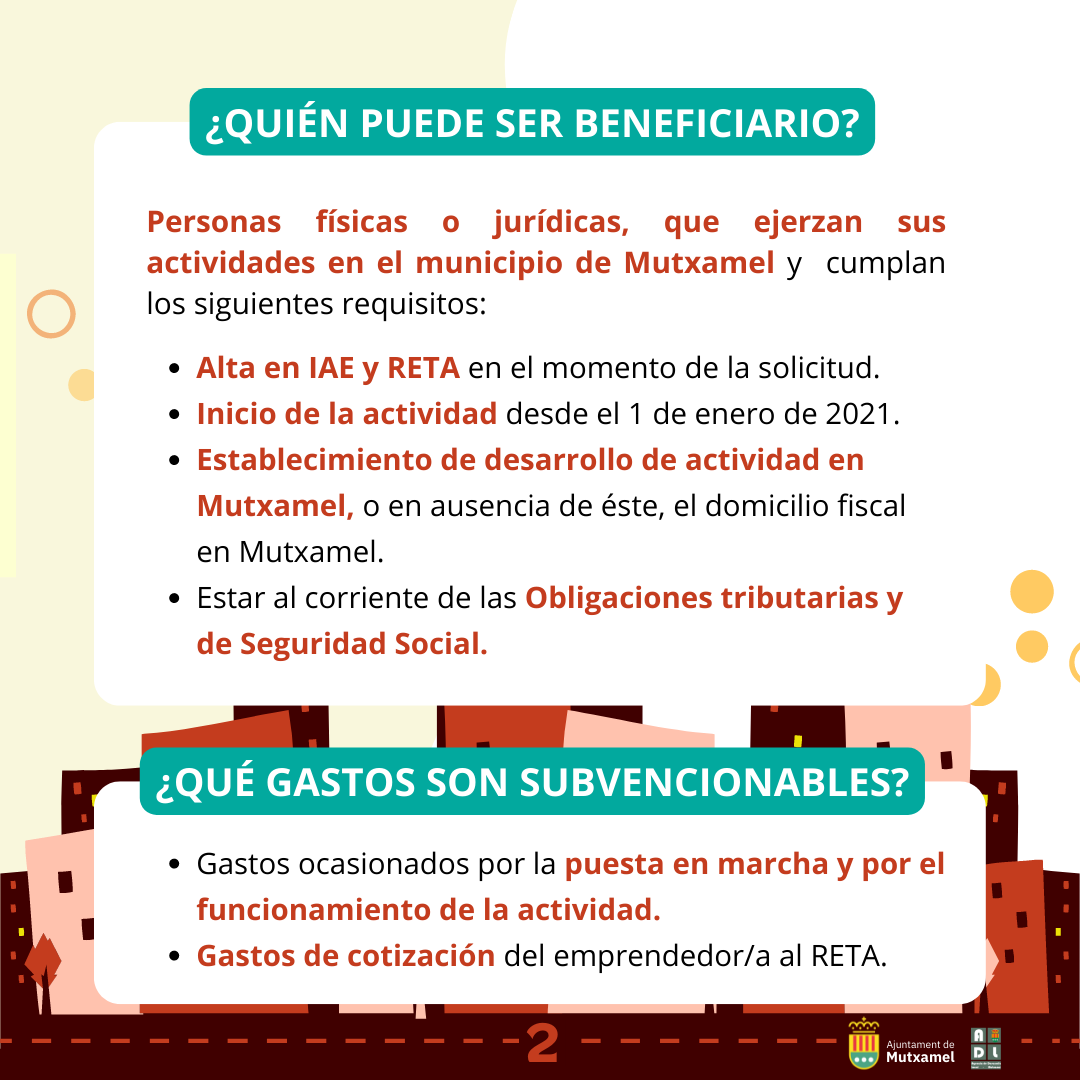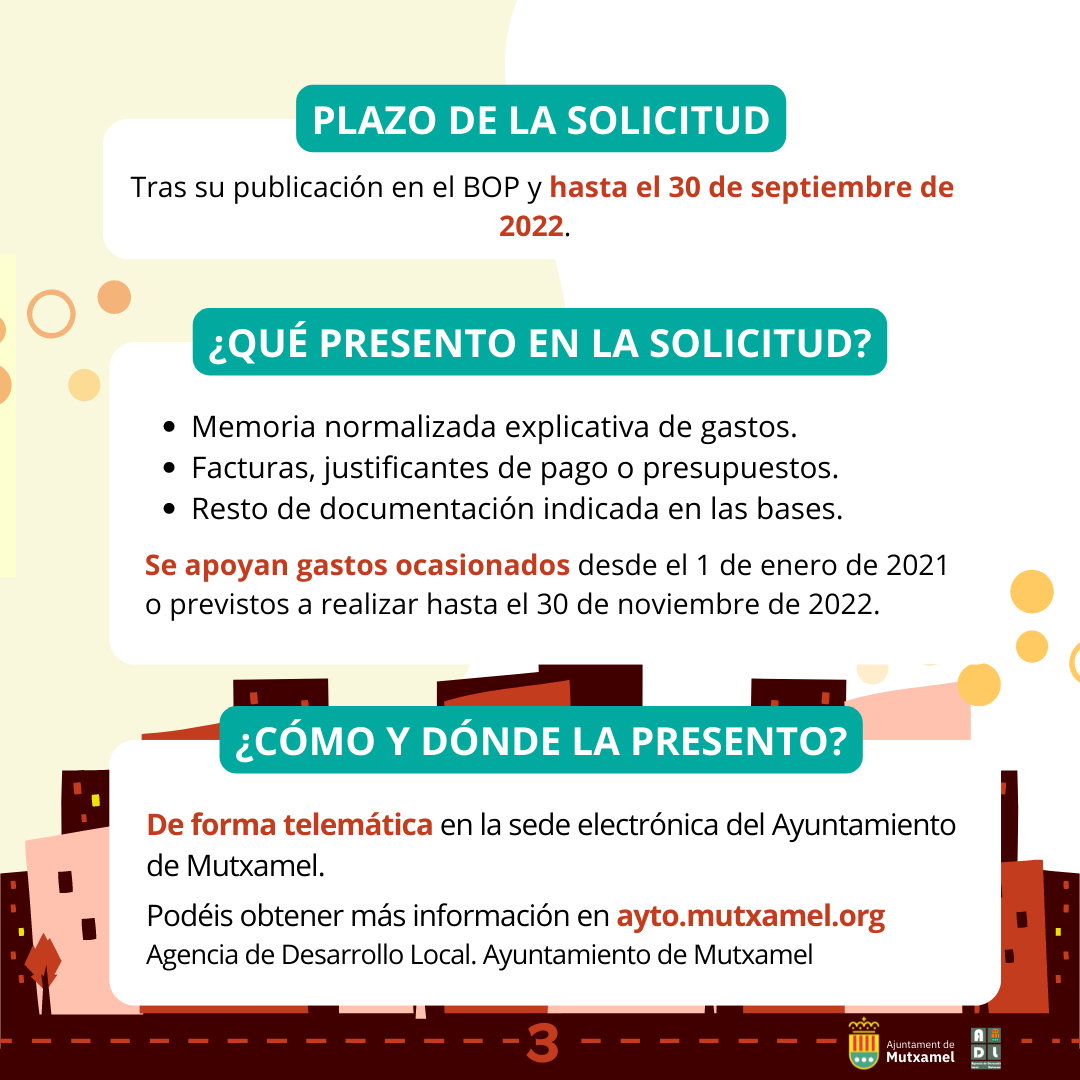 En ambos casos, tanto para dinamizar la actividad comercial del Ravalet como para fomentar el emprendedurismo en todo el municipio, el plazo para solicitar ayudas finaliza el 30 de septiembre. La solicitud se puede realizar de forma telemática, en la sede electrónica del Ayuntamiento de Mutxamel, donde se debe incorporar una memoria normalizada explicativa de gastos con facturas; facturas, justificantes de pago o presupuestos, junto el resto de documentación indicada en las bases. La ayuda se concede para gastos ocasionados desde el 1 de enero de 2021 o previstos realizar hasta el 30 de noviembre de 2022.