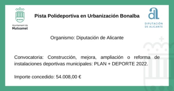 Convocatoria: la construcción, mejora, ampliación o reforma de instalaciones deportivas municipales: PLAN + DEPORTE 2022. Importe concedido: 54.008,00 €