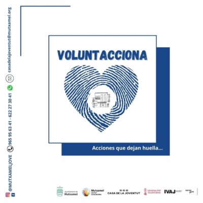 Os presentamos la acción número 10 del ámbito de actuación de Desarrollo Personal y Comunitario del I Plan de Juventud de Mutxamel: “Voluntacciona”. Un programa de voluntariado de la Concejalía de Juventud, para jóvenes de 12 a 30 años que quieran realizar voluntariado en: