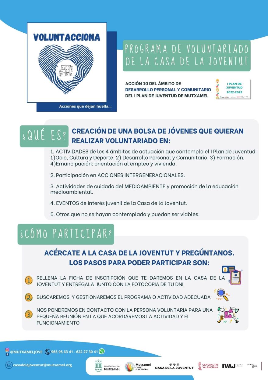 Para más información os podéis poner en contacto con el Equipo de la Casa de la Joventut a través de Instagram: @mutxameljove, telefónicamente al 965956341 o 622273041, o en el correo electrónico: casadelajoventut@mutxamel.org.