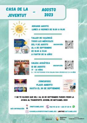 Además, todos los miércoles de 10.00 a 12.00 del 9 de agosto al 6 de septiembre, tendremos un taller de valenciano de expresión oral y escrita. El 12 de agosto, día de la Juventud, tenemos programada una salida acuática para jóvenes de 17 a 30 años, y el 2 de septiembre habrá otra salida para jóvenes de 12 a 16 años.