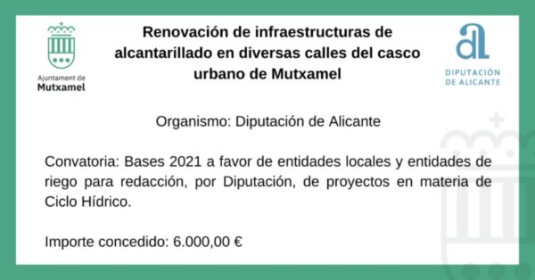 Convocatoria: para entidades locales y entidades de riego para redacción, por Diputación, de proyectos en materia de CICLO HÍDRICO. Importe concedido: 6.000,00 €